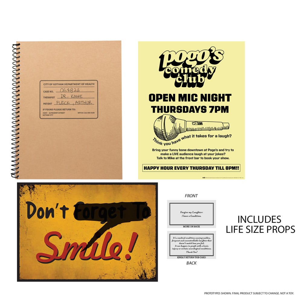 - Repliki rekwizytów: Zawiera również replikę notatnika Jokera, metalowy znak "Don't Forget to Smile", plakat Open Mic Night (papierowy) oraz kartę "Forgive my Laughter" (kartonową).