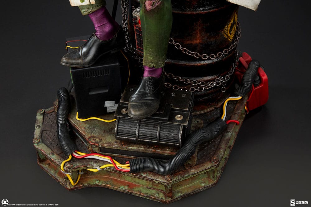 Figurka wykonana jest z dbałością o szczegóły, co sprawia, że każdy element, od klasycznego zielonego garnituru po charakterystyczny kapelusz, jest wiernym odwzorowaniem postaci. Riddler trzyma w jednej ręce papierową zagadkę, a w drugiej detonator, co dodaje dramatyzmu całej scenie. Złożona baza, wypełniona elementami takimi jak plany budynku czy klucze elektroniczne, sprawia, że figura emanuje tajemniczością i napięciem, idealnie oddając charakter tej postaci.