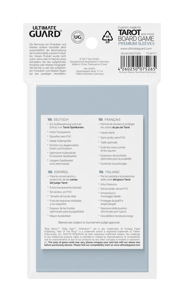 W świecie gier planszowych oraz tarota, odpowiednia ochrona kart jest kluczowa. Pakiet zawiera 50 koszulek, które sprostają wymaganiom najpopularniejszych gier, takich jak Blue Moon™, Elder Sign™, War Of The Ring™ oraz Infiltration™.