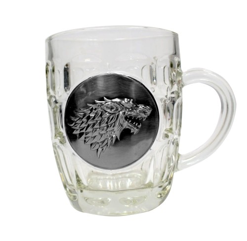Szklany kufel z metalowym logo Stark.