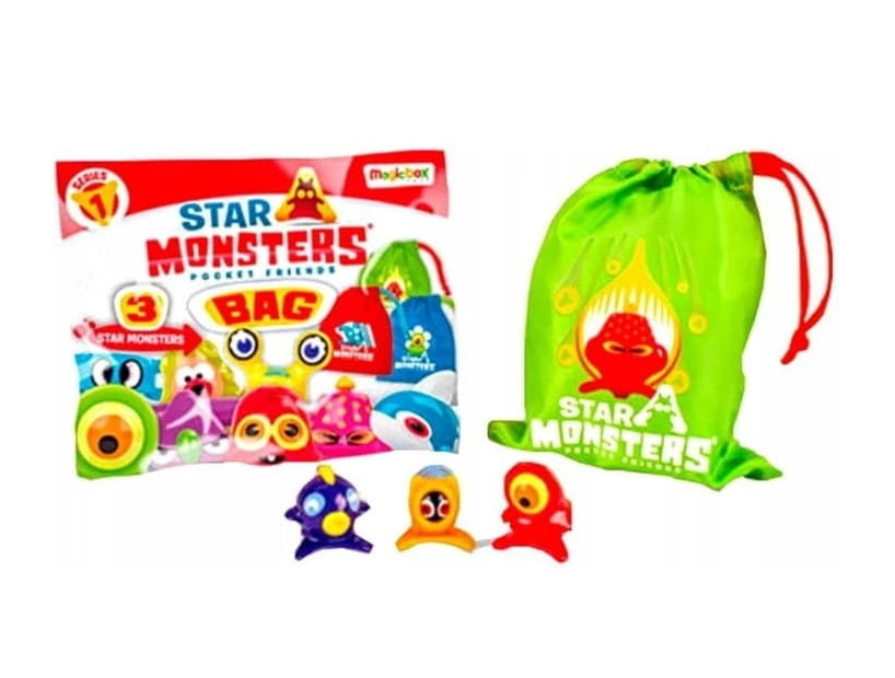 Saszetka niespodzianka z serii Star Monsters – Pocket Friends, zawierająca 3 losowe figurki. Figurki przedstawiają kolorowe potworki z Serii 1. Wzory i kolory są wysyłane losowo, bez możliwości wyboru.